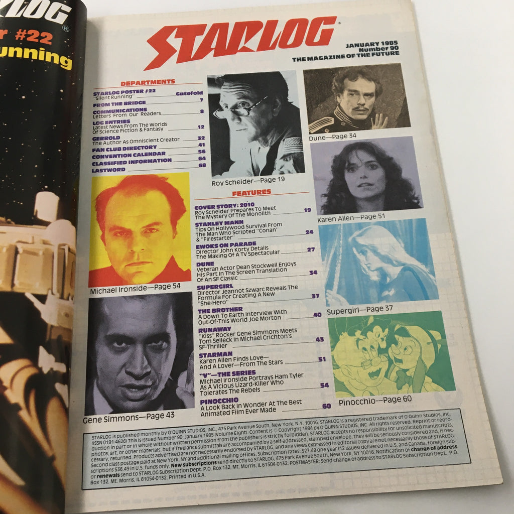 Explore the captivating world of vintage magazines with this classic issue of Starlog Magazine from January 1985, issue number 90. This rare collectible features renowned actor Roy Scheider, known for his iconic roles and compelling performances. On the cover, Scheider graces the readers with a striking portrait, inviting them to dive into exciting tales from the cinematic universe and the realm of science fiction.
