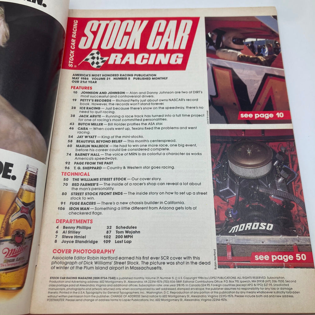 Dive into the thrilling world of vintage auto racing with this classic issue of Stock Car Racing magazine from May 1986. This collectible magazine features an in-depth exploration of Dick Williams' Street Stock racing team and highlights the adrenaline-fueled culture of the sport during this iconic era.