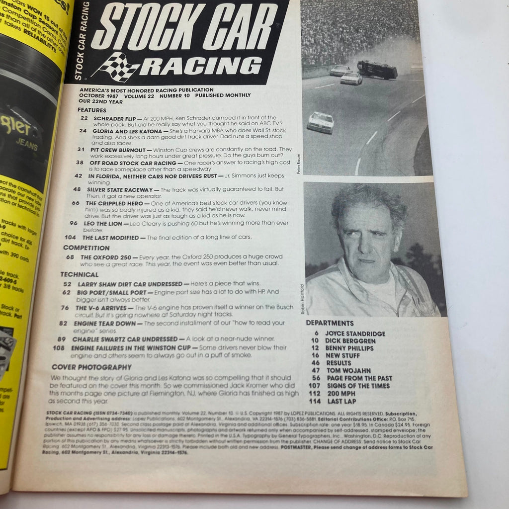 Discover the charm of collecting with this vintage magazine, the Stock Car Racing Magazine from October 1987, featuring Gloria and Les Katona on the cover. This particular issue offers a fascinating glimpse into the world of stock car racing during the late 1980s, showcasing the dynamic culture and the thrilling events that characterized the sport at that time.