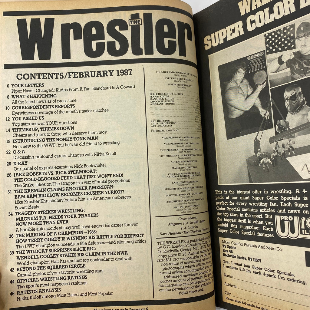 Introducing the February 1987 issue of The Wrestler Magazine, a must-have for any serious collector of vintage magazines. This iconic edition features the legendary Magnum T.A., a figure who shaped the wrestling scene during this era.