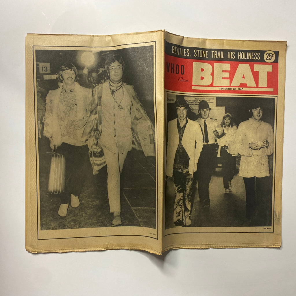 This September 23, 1967 issue of Whoo Beat Tabloid Magazine reflects the rapidly changing music scene just weeks after the death of Beatles manager Brian Epstein. With reports on the Bee Gees’ immigration troubles, speculation about Beatles and Rolling Stones collaboration, and record-breaking performances by Paul Revere and the Raiders, the issue captures the cultural pulse of late 1967.