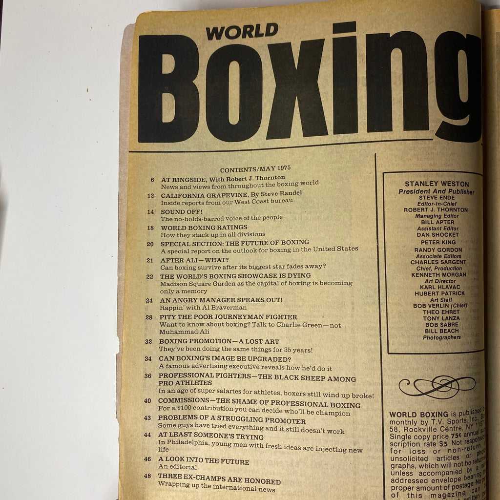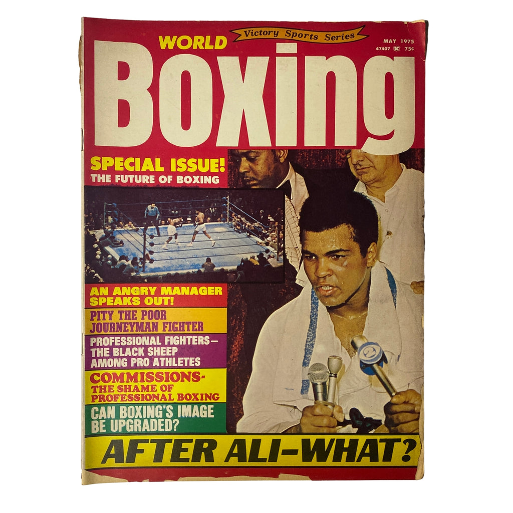 This May 1975 issue of World Boxing captures a pivotal moment in the sport, with Muhammad Ali reigning as its brightest star and the boxing world questioning its future once Ali eventually stepped away. Packed with investigative features, sharp commentary, and a dedicated section on the state and future of boxing, this issue is a strong historical piece for collectors.